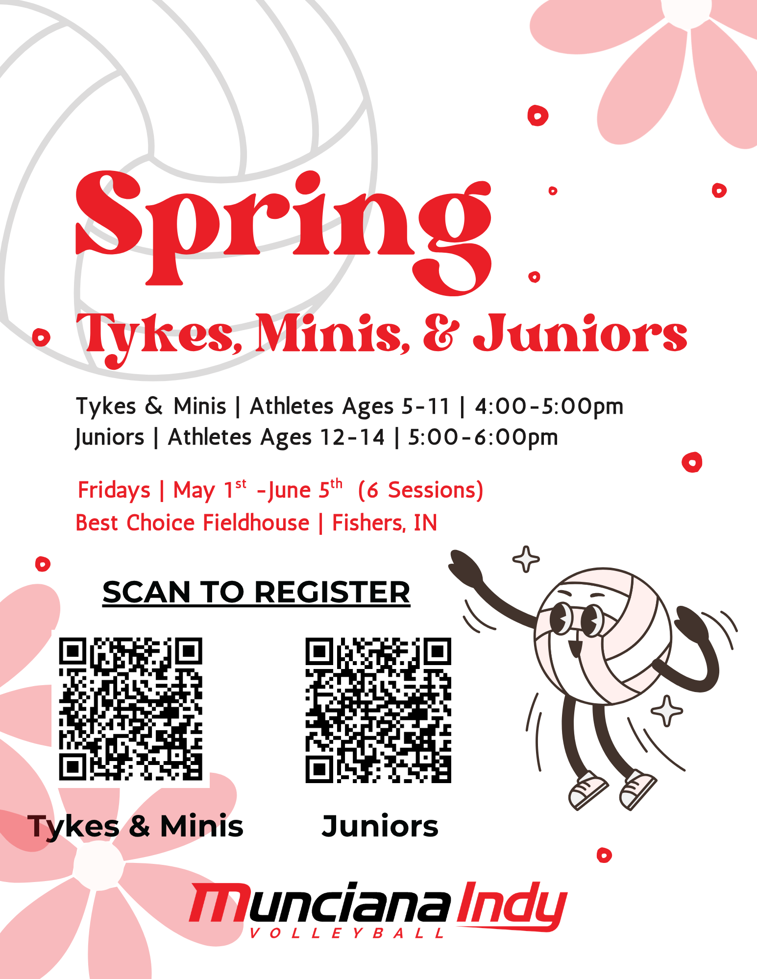 | Spring Volley Tykes & Minis | Boys & Girls Ages 5-11 | May 1st-June 5th (Fridays) | 4:00-5:00pm | Register Here! |